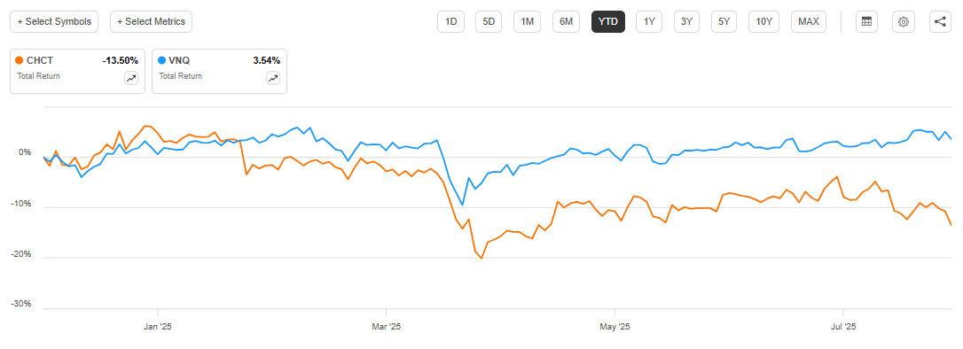 CHCT - Community Healthcare Trust: Recent Pullback Presents A Buying Opportunity July, 31 2025 09:24 AM Community Healthcare Trust Incorporated 2025-07-31 09:24:08 ET Introduction So far in 2025, Community Healthcare Trust ( CHCT ) has underperformed the Vanguard Real Estate Index Fund ETF ( VNQ ), delivering a loss of ~14%: CHCT vs VNQ in 2025 (Seeking Alpha) For further details see: Community Healthcare Trust: Recent Pullback Presents A Buying Opportunity