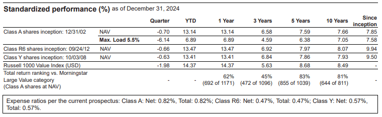 The fund outperformed the Russell 1000 Value Index primarily due to strong stock selection in information technology (IT), while health care, particularly managed health care and pharmaceuticals, detracted.