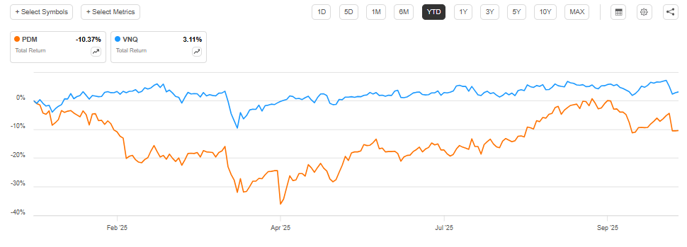 So far in 2025, Piedmont Realty Trust ( PDM ) has underperformed the Vanguard Real Estate Index Fund ETF ( VNQ ), delivering a loss of ~10%: