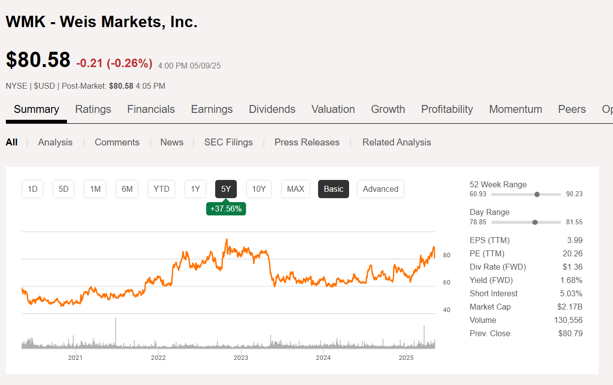 Weis Markets Common Stock Price History And Key Valuation Measures (Seeking Alpha Website May 9, 2025)