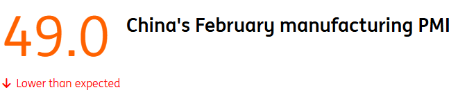 China's official manufacturing PMI declined to 49.0 in February, down from 49.3. The data, published by the National Bureau of Statistics, came in weaker than market forecasts for 49.2. The reading below the 50 threshold, which demarcates expansion and contraction, shows manufacturing has now contracted in 10 of the past 11 months. The 49.0 level itself is in line with multiple other months for a 33-month low....