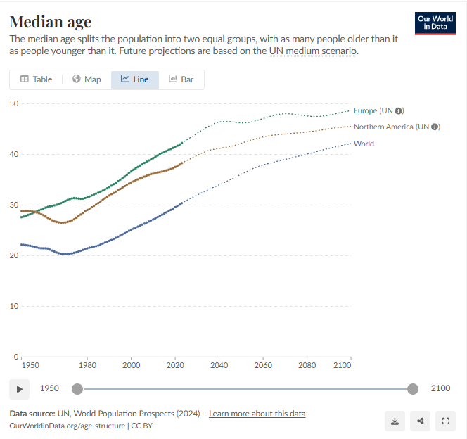 There has been a steady trend of the world getting older. Each year, fewer babies are born, and people are living longer. This leads to an older average population. The median age in Europe and North America, as well as the entire globe, continues to trend higher....