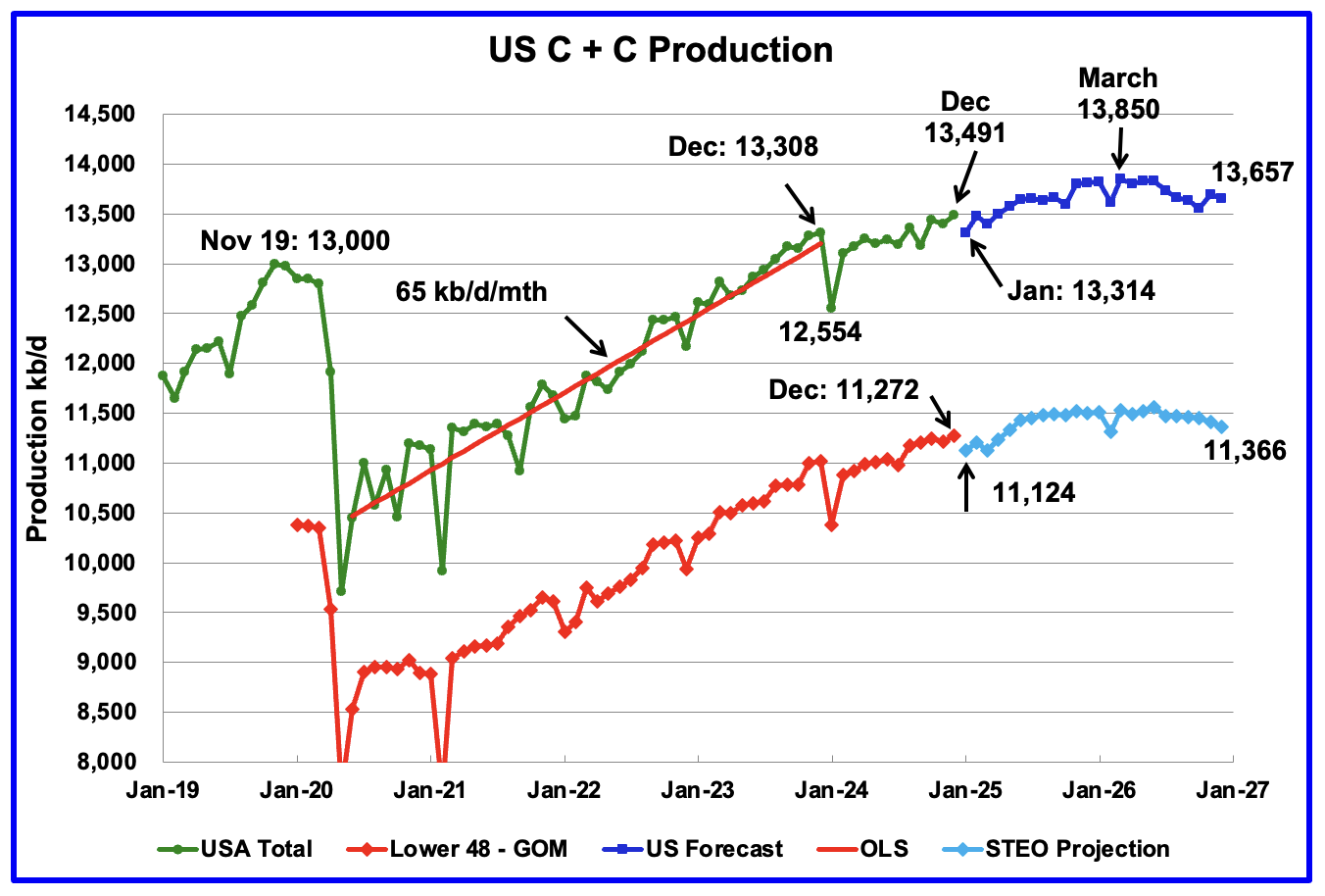 The dark blue graph, taken from the February 2025 STEO, is the forecast for U.S. oil production from January 2025 to December 2026. Output for December 2026 is expected to reach 13,657 kb/d. From December 2024 to December 2026 production is expected to grow by 166 kb/d.