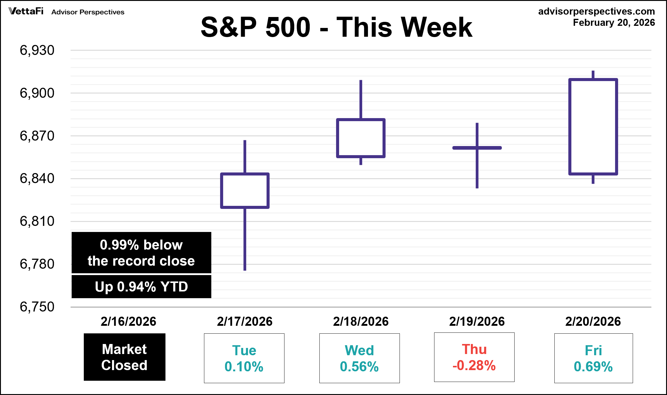 The S&P 500 posted its first weekly gain since January, rising 1.1% after spending the majority of the week in positive territory. This marked the largest gain for the index in six weeks. The index is now 0.99% off its all-time high from January 27, 2026. Here is a snapshot of the index from the past week: